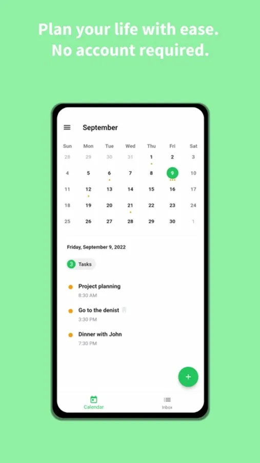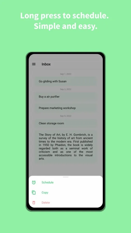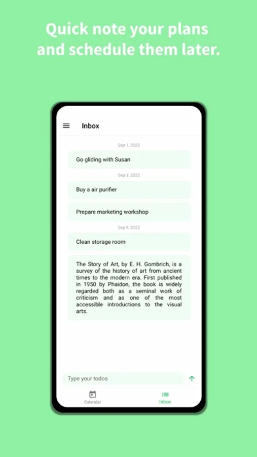 - Inbox tab: use this tab as a draft box for your life and work plans. Long press on an item in the inbox to schedule it as a task in the calendar.