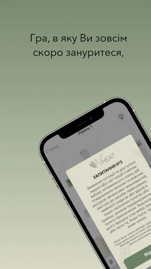 Wheat — додаток, призначенням якого є допомога в боротьбі із психологічним аспектом вимушеної еміграції. Вже незабаром Wheat міститиме інформацію на тему вимушеної еміграції, можливості для зв’язку переміщених осіб в місцях їхнього прихистку, гейміфіковані вправи для боротьби із психологічними наслідками еміграції та інтерактивні ігри, що інформуватимуть користувача щодо теми та сприятимуть психологічній стабілізації. Сьогодні Wheat — це прототип майбутнього додатку. Тут Ви зможете ознайомитися із важливим елементом Wheat: інтерактивними іграми на тему вимушеної еміграції.