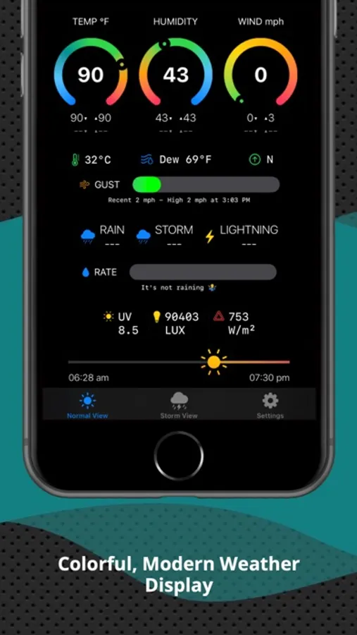 The "Normal View" displays all the relevant data necessary to keep tabs on conditions such as temperature, humidity, wind speed, wind gusts, daily rain, rain storm totals, rain rate, and sky conditions such as UV, LUX and solar radiation. It also displays sunrise and sunset.