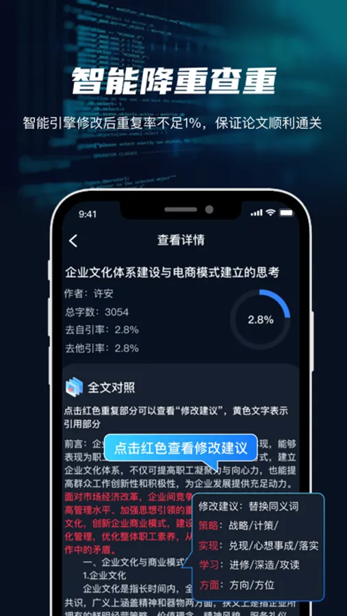 三:我们的App还具备论文查重和降重的功能。通过内置的高级算法,它可以快速准确地检测论文中的重复内容,并给出相应的建议和修改意见。这个功能可以帮助用户避免抄袭和重复发表的问题,提升论文的质量和学术水平。