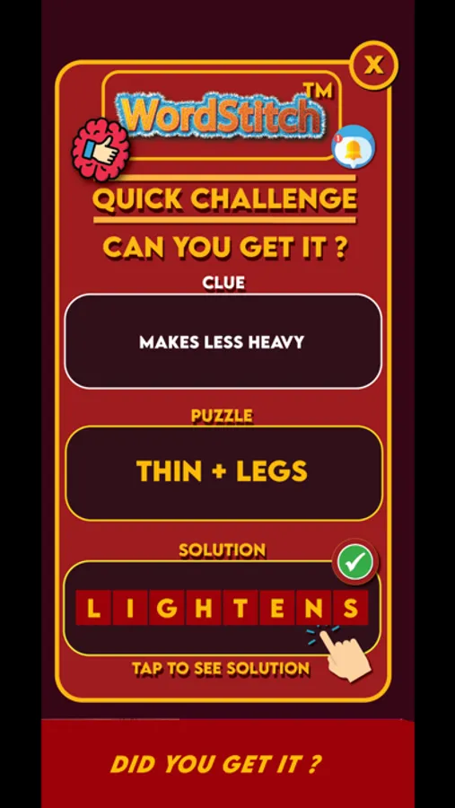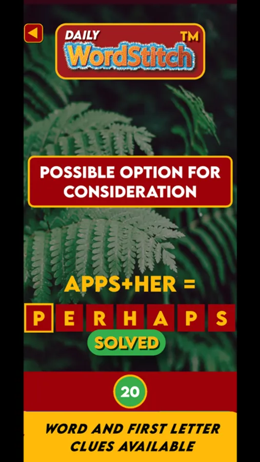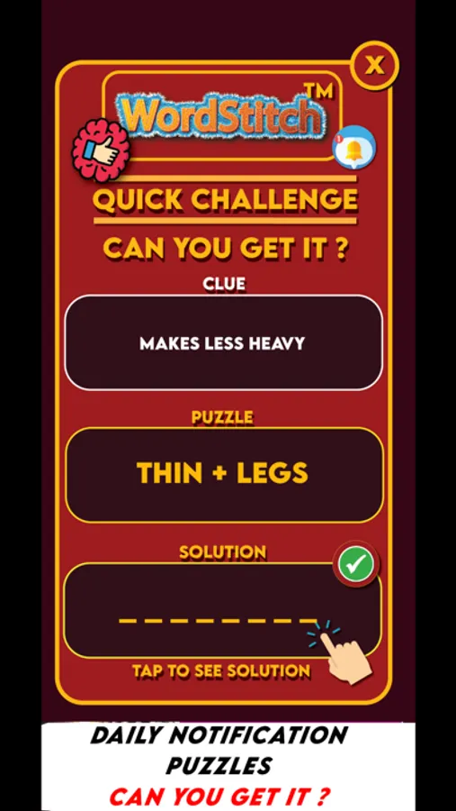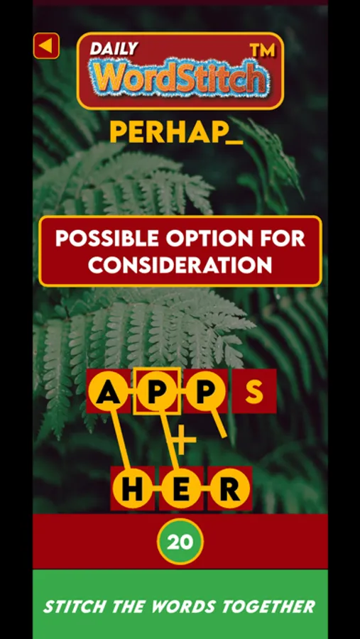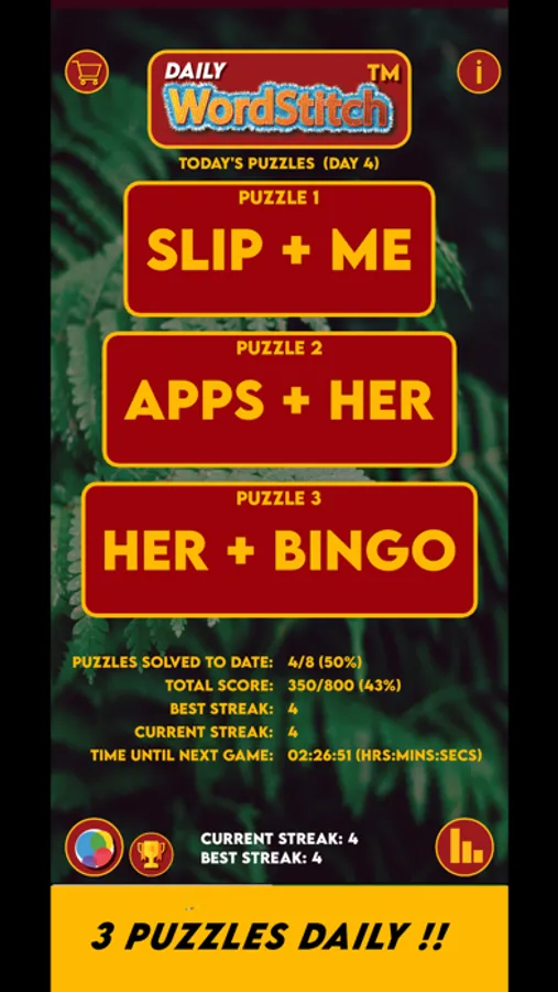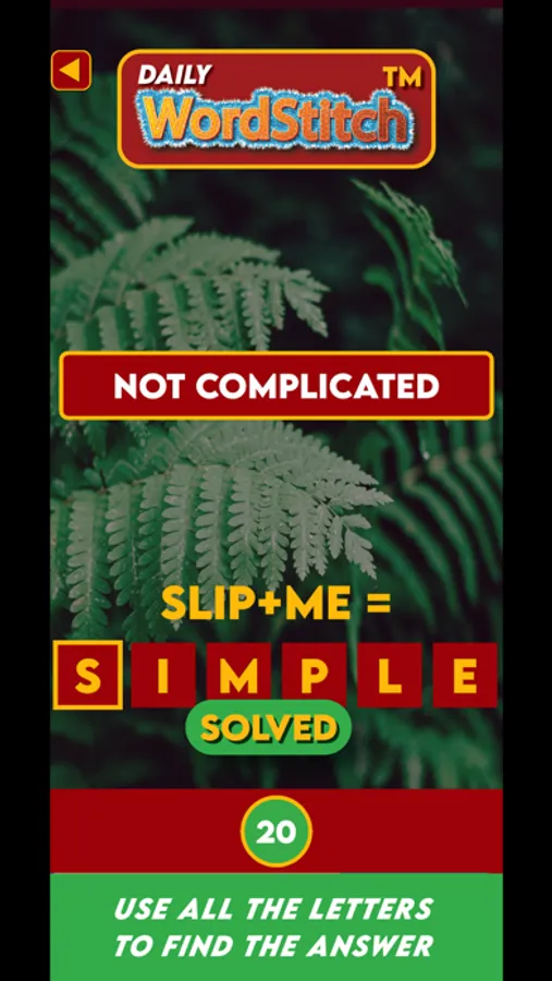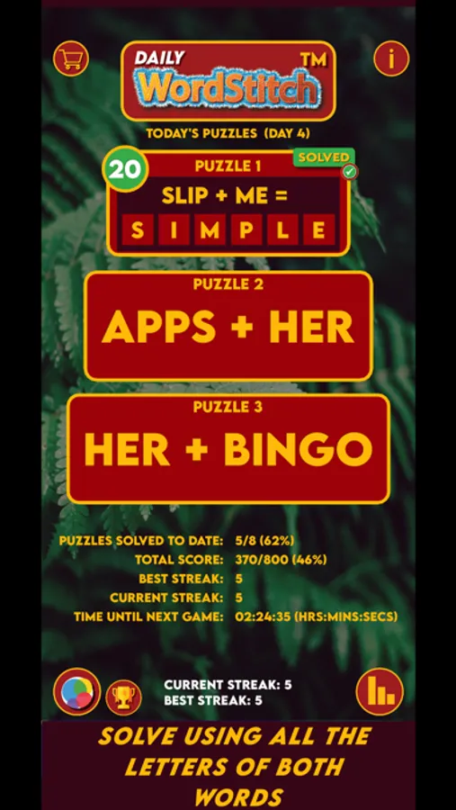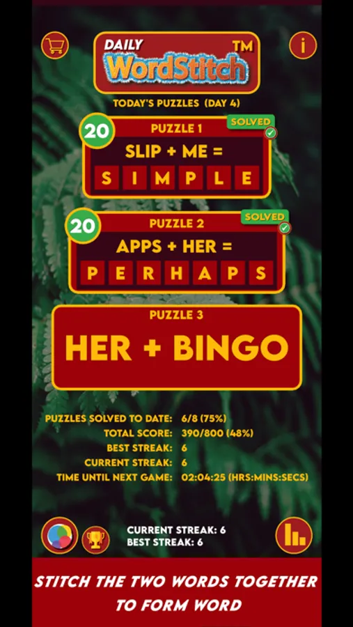 A NEW unique challenging daily word challenge. Using all the letters from the two given two words stitch them together too find the new word. A crossword style clue and first letter clues are available to help you. Using clues costs you points. 3 new puzzles are provided daily. Solve the puzzles and climb the leaderboards and gain achievements. Monitors your streak for continuous play. A bonus round also provided daily for users having a high scoring 3 star day. Make sure you enable notifications to get a daily practice round every day ...Nothing else like it ... challenge your brain , improve your word knowledge... gets harder as the days go on ... a great quick coffee time word challenge ... enjoy .... UK and US spellings possible.
