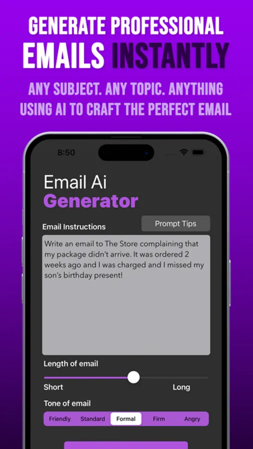 Tired of staring at a blank screen, struggling to find the right words for your emails? Say goodbye to writer's block and hello to effortless email composition with the revolutionary "AI Email Generator" app for iOS. Whether you're drafting a formal complaint, a persuasive job application, a courteous request, or any other type of email, this app is your go-to tool for crafting eloquent and effective messages in just a few taps.