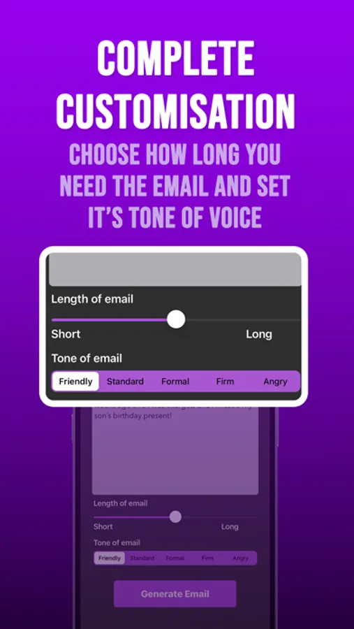 Diverse Email Categories: No matter the purpose of your email, our app has you covered. Choose from an array of pre-defined categories, such as complaints, job applications, requests, follow-ups, and more. Each category is finely tuned to ensure your message hits the mark.