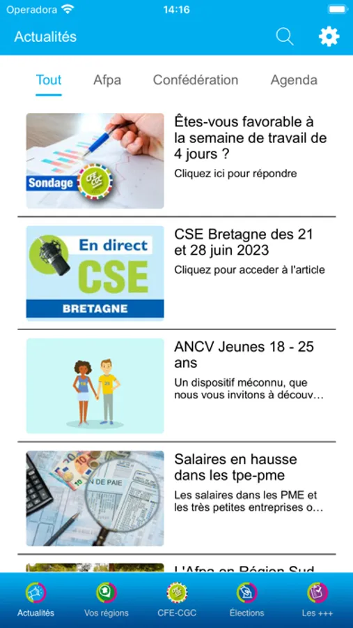 Bienvenue dans l'application officielle de la CFE-CGC AFPA, votre outil incontournable pour vous tenir informé(e) sur toutes les actualités syndicales, les accords, les élections et bien plus encore. Restez connecté(e) avec votre région et découvrez les équipes qui vous représentent. Rejoignez-nous pour participer activement à la défense de vos droits et de vos intérêts professionnels !