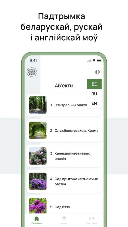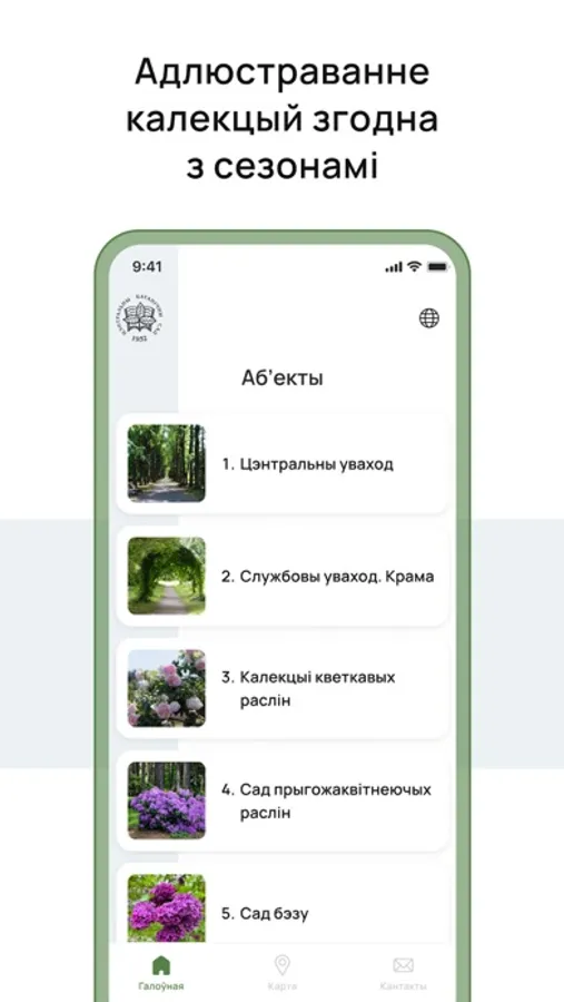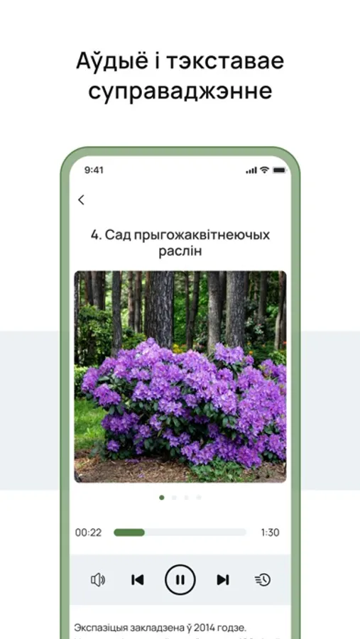 Аўдыягід па Центральным батанічным садзе НАН Беларусі дазваляе правесці экскурсію па садзе і даведацца пра кветкавыя калекцыі, "Востраў мастацтваў", экалагічную сцежку, аранжарэі з трапічнымі і цытрусавымі раслінамі і многае іншае.
