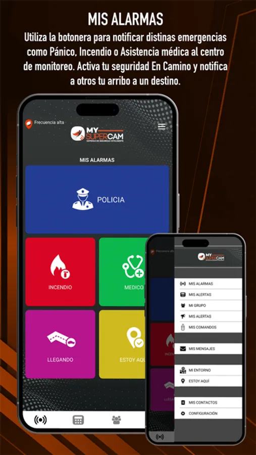 - Botones de pánico policial, bomberos y médico, con envío de posición geográfica, sonido e imágenes de tu emergencia (MIS ALARMAS)