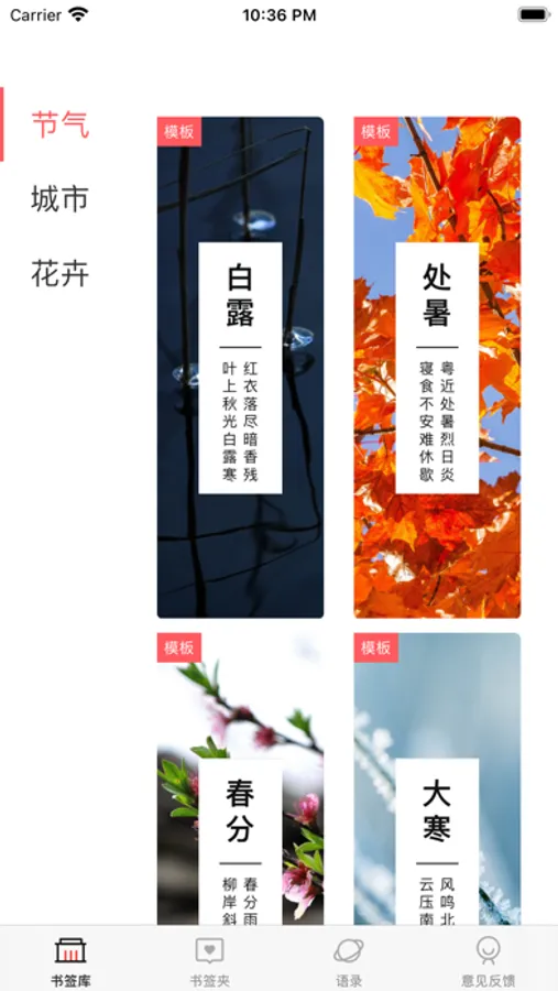多种模板:选择您喜欢的书签模板,包括节气、城市、花卉等多种风格,为您的书签增添独特的元素。