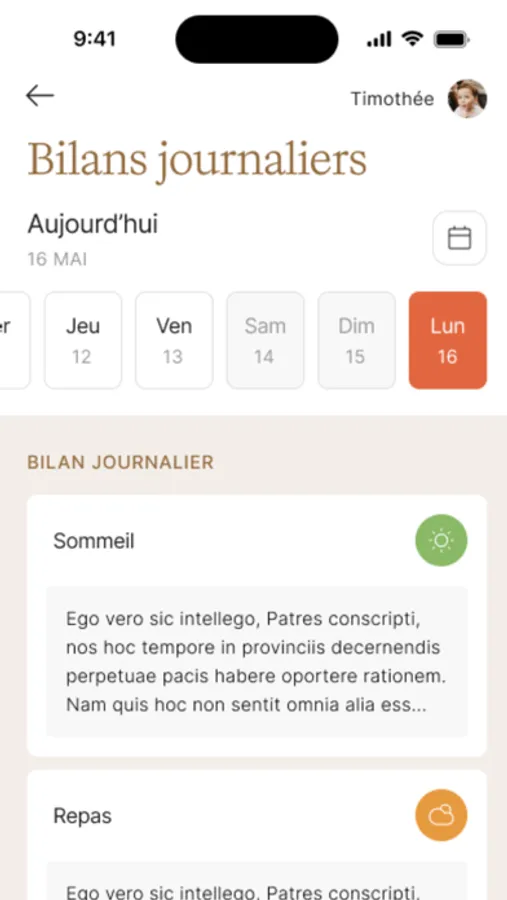 Suivi Personnalisé : Consultez le dossier de votre enfant, y compris ses activités, ses progrès et ses besoins spécifiques. Restez informé de sa journée à la crèche, de ses repas, de ses siestes et bien plus encore.