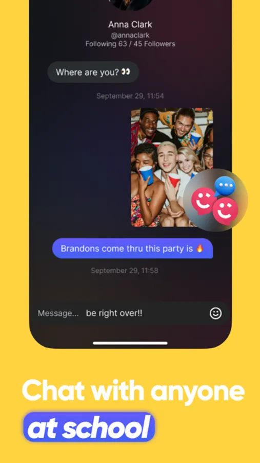 Chat with anyone on campus: Build real connections with your school's community. Talk to the new kid in class, plan your study sessions, or just come hang out. Share private messages, photos, videos, or be the hero who shares notes with the group.