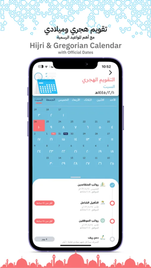 * (Calendar) A Hijri and Gregorian calendar with a simple and attractive design, showing the current day in a distinctive color, as well as showing the Hijri date and its equivalent in Gregorian at the same time.
