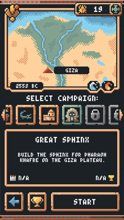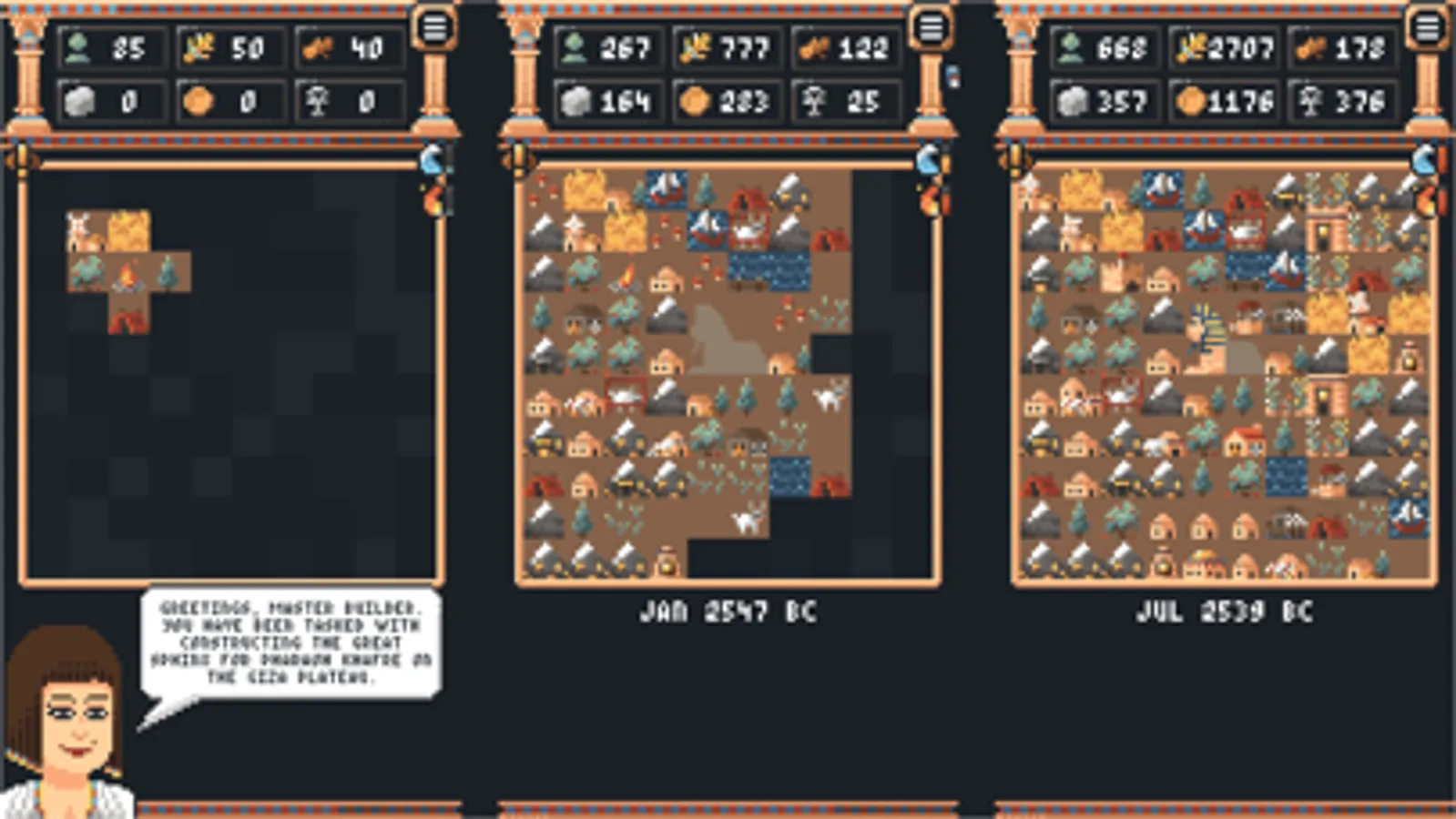 Tiny Pharaoh is a real-time strategy game set in Ancient Egypt. Become the master builder and turn the meadow into a city with a functional economy. Build houses, farms, mines, sawmills, and much more. Accumulate resources and achieve significant goals, such as building pyramids, the Great Sphinx, and many other famous buildings!
