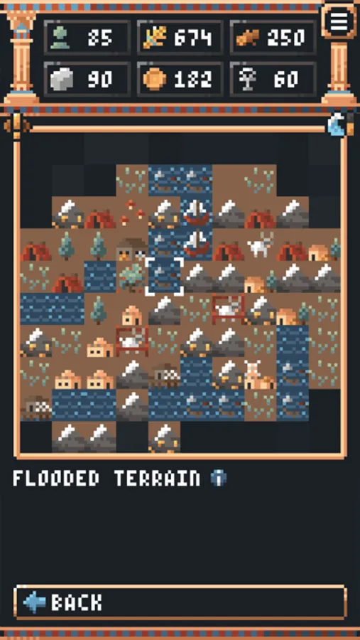 Each scenario map is divided into 100 tiles, where each tile can support a different building. Each building produces varying amounts of resources. Discover all the tiles, choose your building strategy, and achieve your goal as quickly as possible.