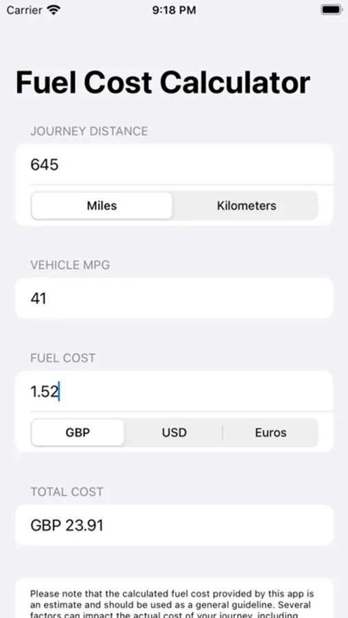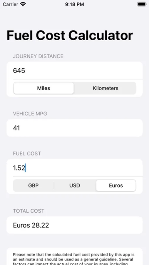 FuelCostPro is your reliable travel companion that simplifies fuel expense planning. Whether you're on a road trip or commuting daily, our app lets you effortlessly calculate your fuel costs based on distance, MPG, and fuel prices. Choose from various currencies for instant conversions, and get an estimated cost breakdown tailored to your needs. Please note that while FuelCostPro offers accurate estimates, factors such as weather, traffic, and driving habits can influence actual costs. Make every journey a budget-smart one – download FuelCostPro today and hit the road with confidence!