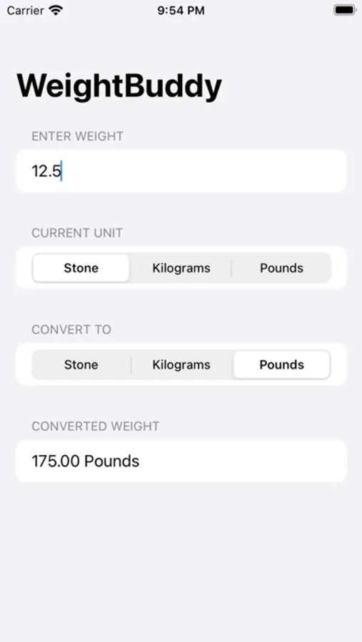 Easily convert weight units with WeightBuddy, the user-friendly app designed for your convenience. Created by an indie developer, WeightBuddy simplifies weight conversions between stone, kilograms, and pounds, putting precision at your fingertips. Whether you're a health enthusiast or a frequent traveler, WeightBuddy ensures hassle-free conversions with its intuitive interface. Input your weight, choose the units, and let WeightBuddy do the math, providing accurate results in an instant. Download WeightBuddy now and experience the simplicity of weight conversions in a whole new way. Your reliable weight conversion companion is just a tap away!