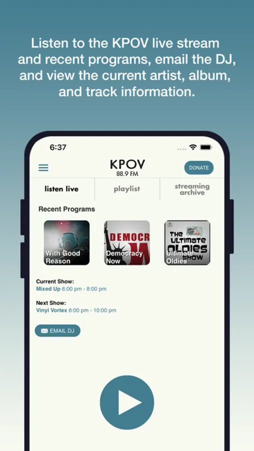 The KPOV App allows you to listen to KPOV High Desert Community Radio, pause and rewind the live audio, and view the program schedule for KPOV all at once! You can explore and listen to archived content whenever you want, share stories with your friends and feedback with the station!
