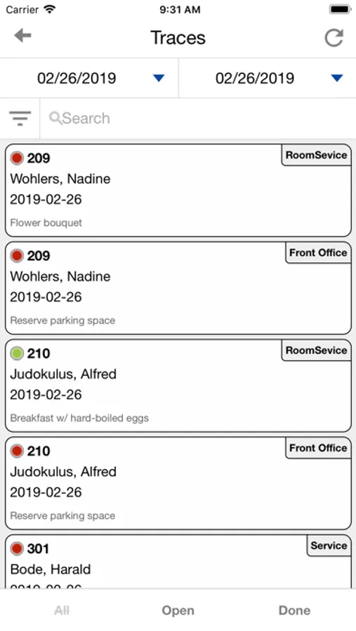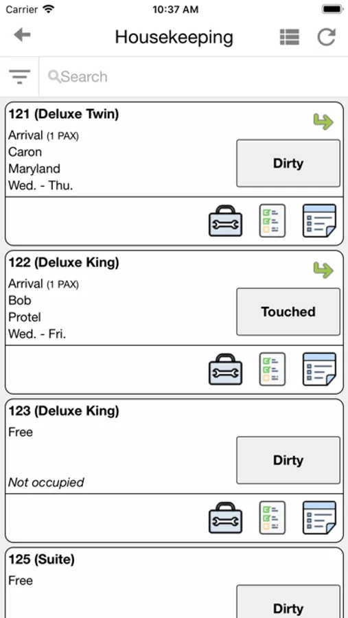 - Housekeeping list: Check and change the occupancy status (occupied, vacant) and the room status (cleaned, dirty, touched, cleaning in progress, checked).