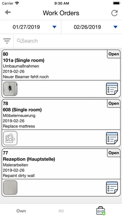 - Maintenance orders: Create and edit orders, add new pictures using the mobile phone or use pictures from within the app.