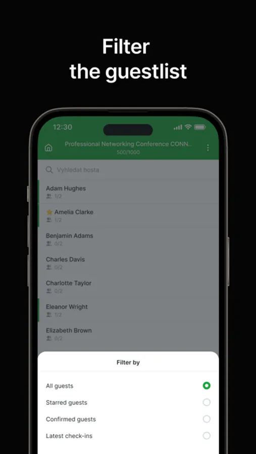 • Add your own notes and additional information to the guests. You can find out to which group the guest belongs or to which table you should seat him already while check-in. You can filter guests and see if all important guests have already arrived.