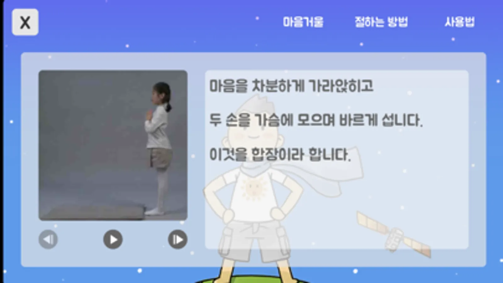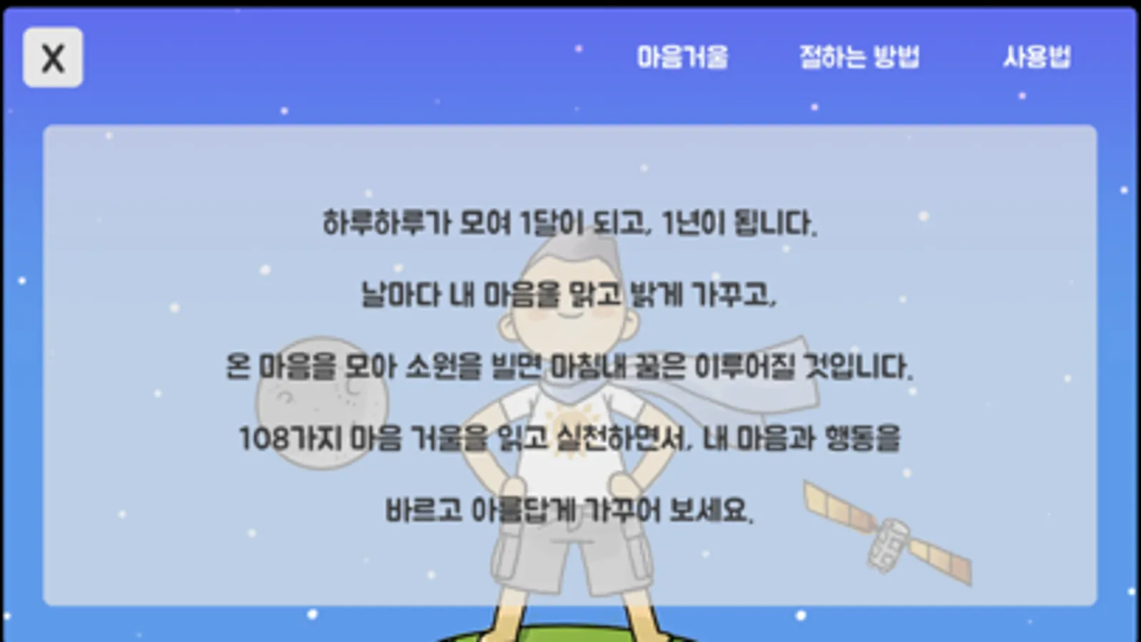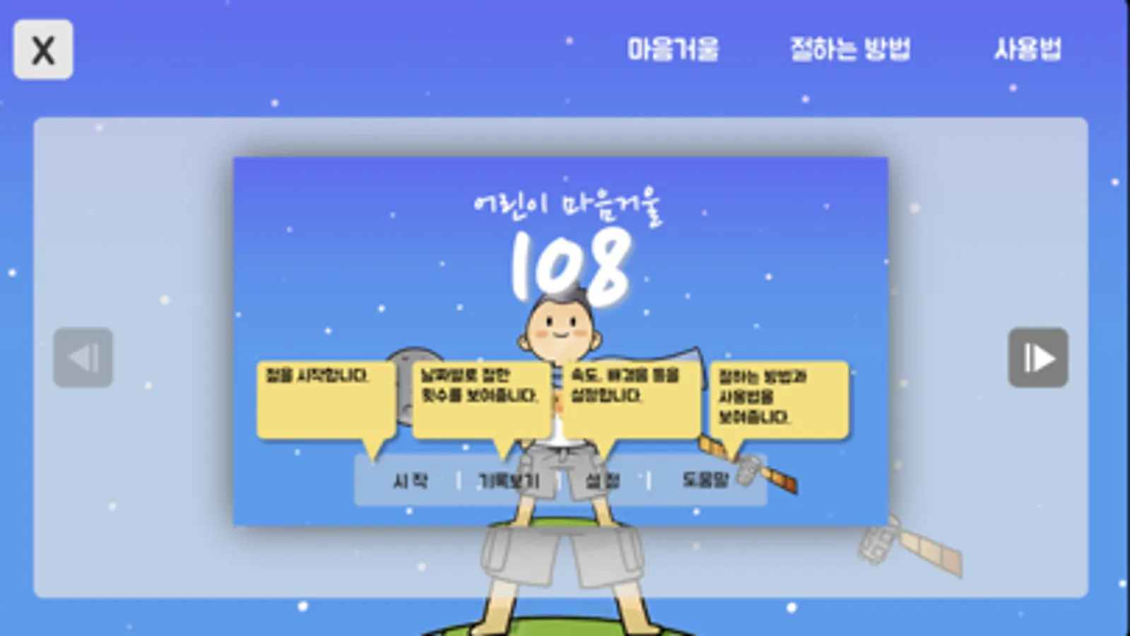 어린이에 맞는 108가지의 발원문과 함께 개인의 상황에 따라 다양하게 활용할 수 있는 절수행 앱입니다.