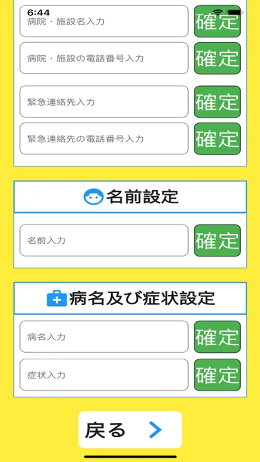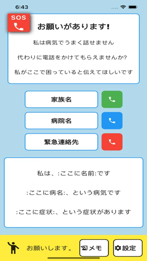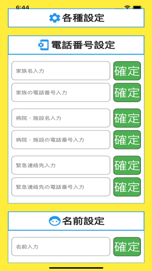 ・設定画面で、家族の電話番号、病院や施設の電話番号、緊急連絡先の電話番号、氏名、病名、症状など必要な事項を事前に入力しておいて下さい。