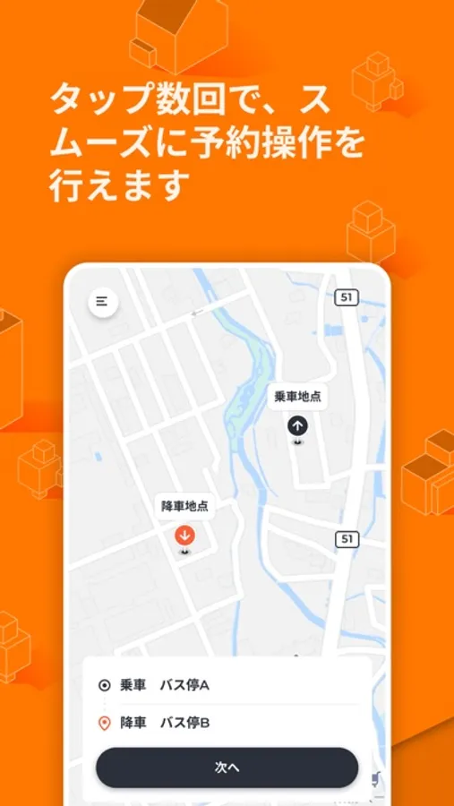 ① 地図上のピンを動かすか、リストから選択して、乗車地点と降車地点を設定します。※「現在地ボタン」をタップすると、現在の位置情報が表示されます。