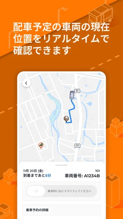 アプリ上に車両の現在地が表示されます。乗車位置に接近すると通知されますので、乗車位置でお待ちください。