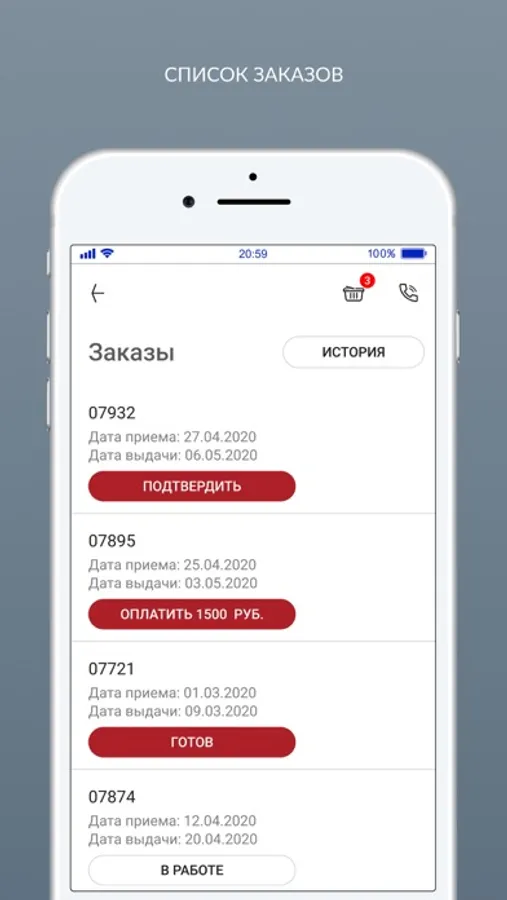 - посмотреть свои заказы в работе, их статусы, историю заказов;