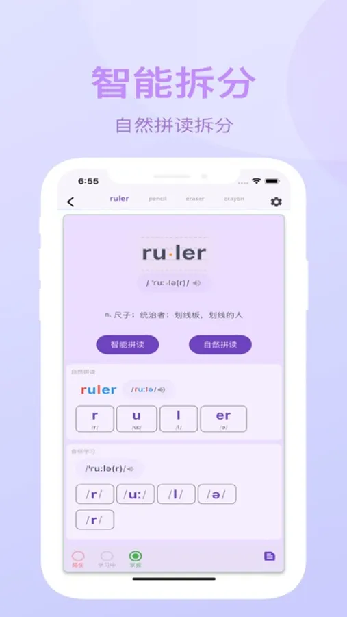 同步教材单词,智能拆分单词,自然拼读拆分。自然拼读,音标。