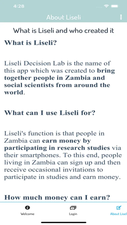 Liseli Decision Lab is the name of this app which was created to bring together people in Zambia and social scientists from around the world. Liseli's function is that people in Zambia can earn money by participating in research studies via their smartphones. To this end, people living in Zambia can sign up and then receive occasional invitations to participate in studies and earn money.