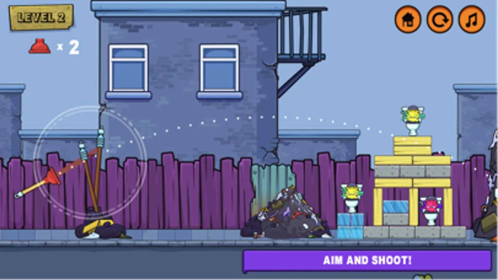 You can choose between two angry plungers depending on your need and purpose. Hit everything around, and most importantly, take into account accurate aim and destroy the toilet monsters with your angry plungers one by one!