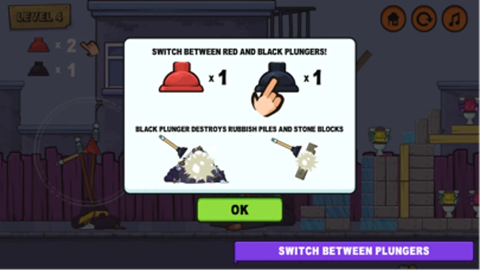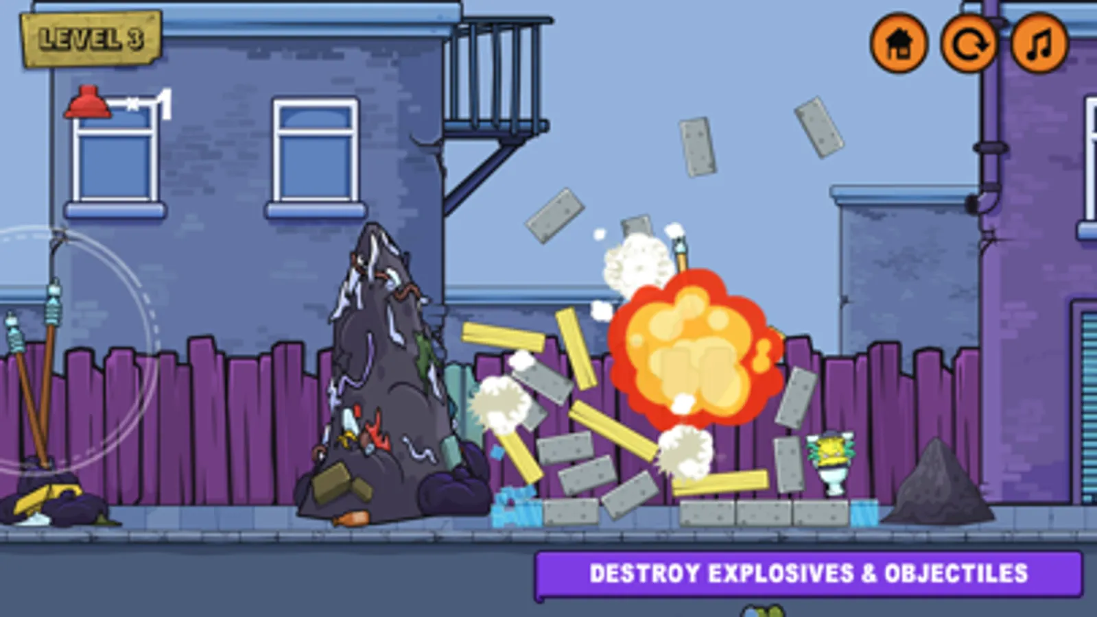 You have the opportunity to complete each level in several ways. Perhaps you want to destroy more objects around? No problem! Or maybe you want to throw your angry plunger with enough precision to hit multiple toilet monsters in one throw? The choice is yours.