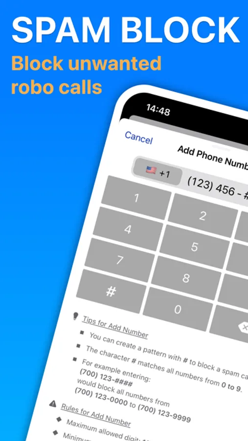 ◉ You can create pattern with the character "#" to block spam calls with pattern
