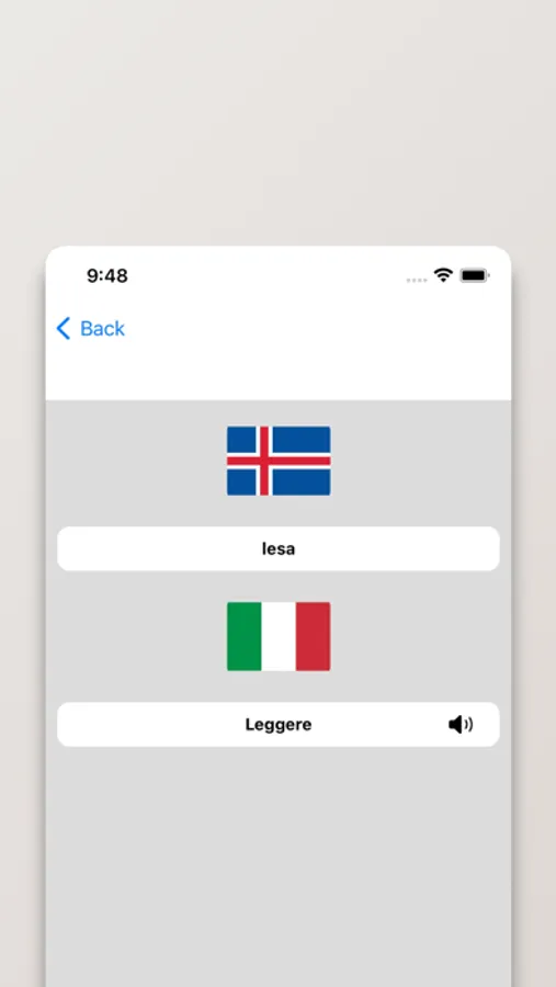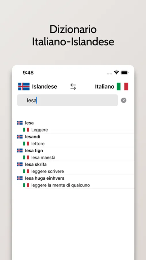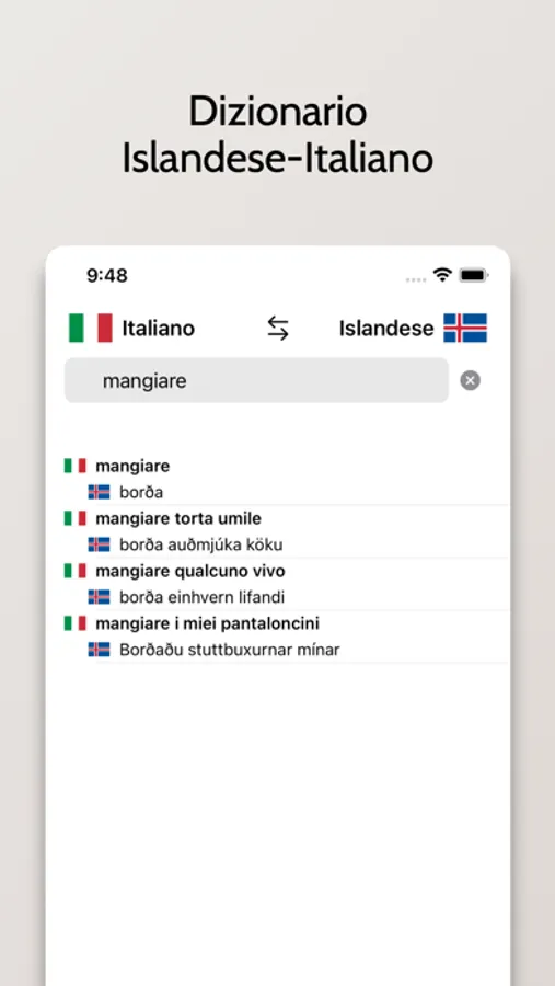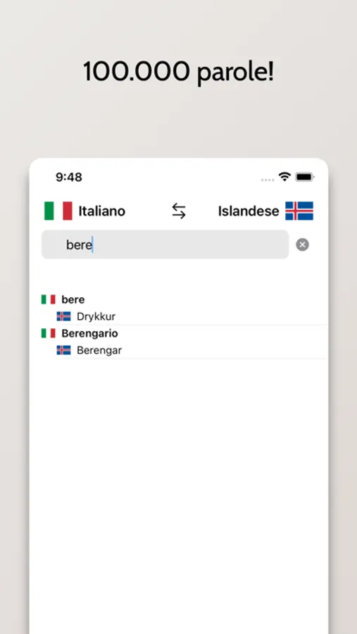 - Possibilità di cercare a partire da parole in Italiano o Islandese