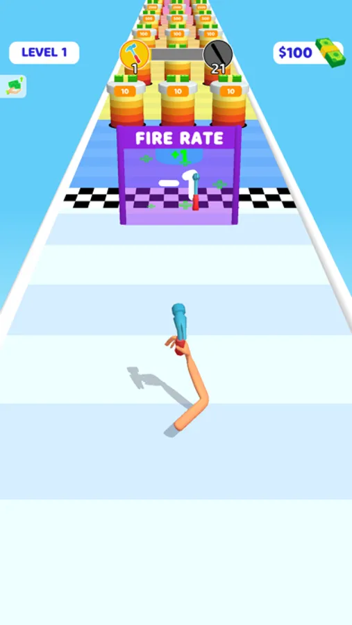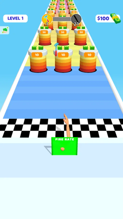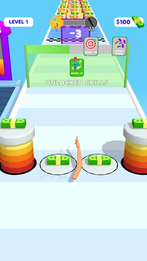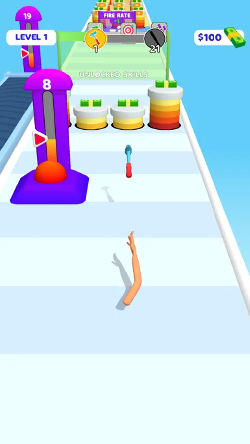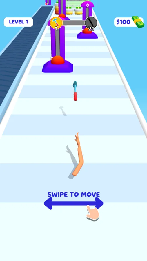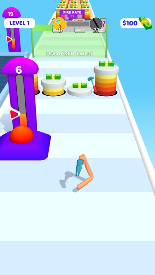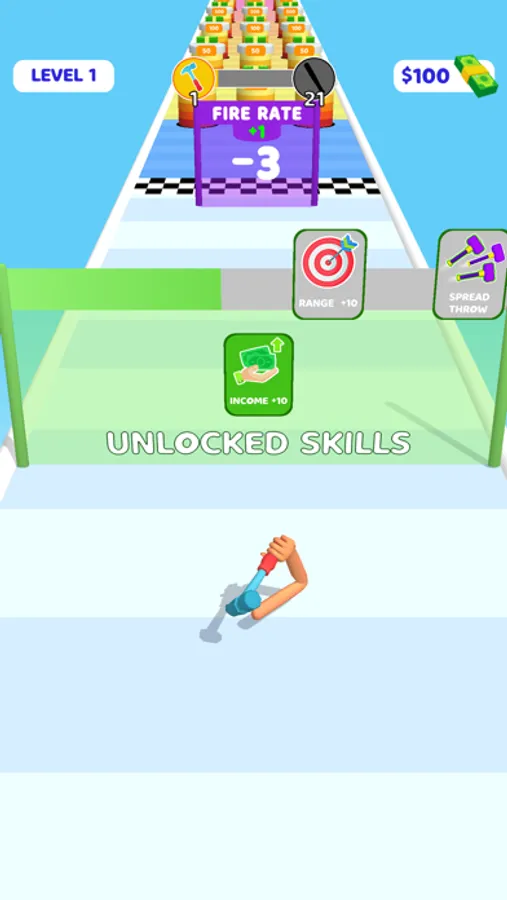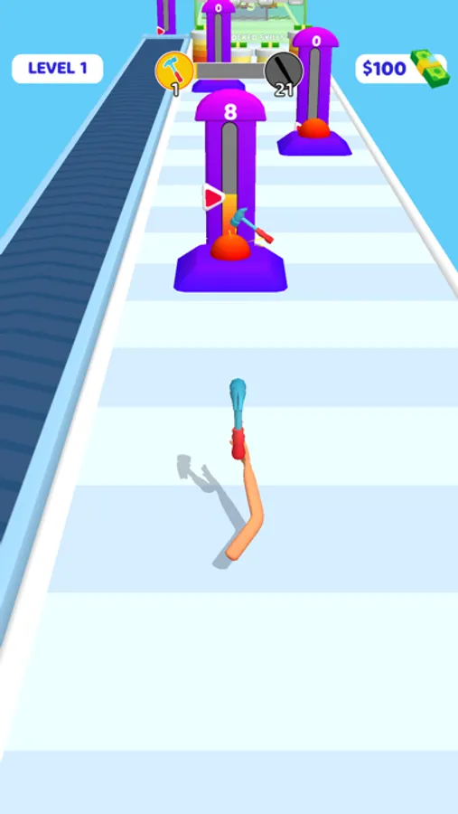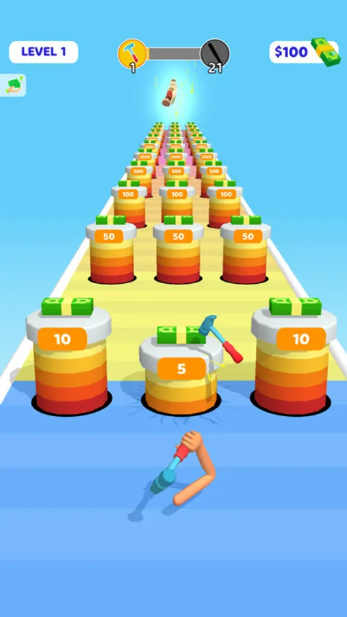 Throw your hammers and while they do their work, you try to get to the milestone gate without getting hit by obstacles. Pass through the skill gate. Keep playing stronger!