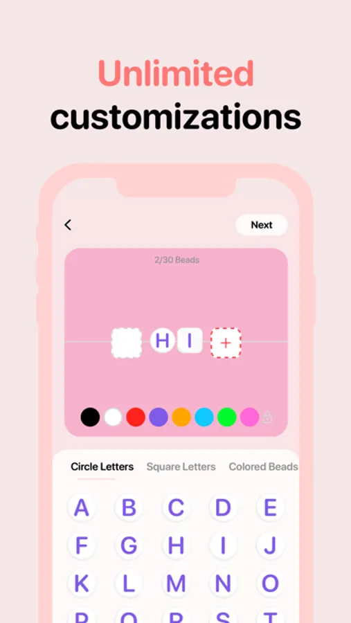 Please note that the app offer a premium subscription, the "best friends club", on a weekly or monthly basis. While all users have access to black-on-white letter beads and cylinder beads, the premium subscription will give you access to the following: