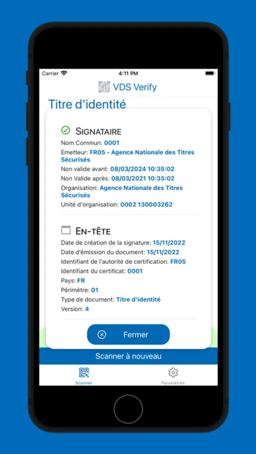 The VDS Verify application is based on our solution for creating, encoding and signing VDSs (AFNOR and ISO standards), which is the only one currently used in production. In particular, it is used by the French government to create the VDSs affixed to the France Identité single-use identity proof.