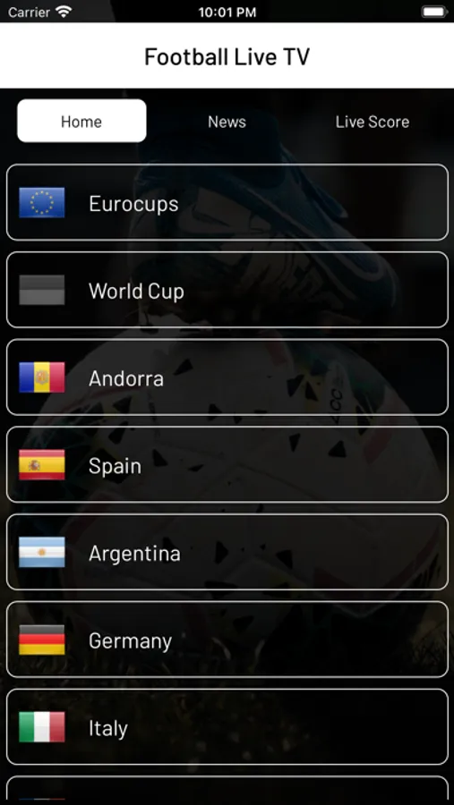 Home: The Home Screen displays 24/7 Live Soccer Channels in Ultra-HD from around the world.