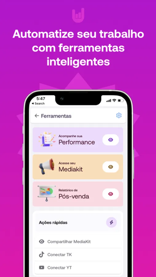 E outra com ferramentas que os ajudem no dia a dia, como: mídia kits atualizados automaticamente, relatórios de resultados das campanhas automáticos e organização dos seus dados das principais plataformas: Instagram, Tiktok e Youtube.