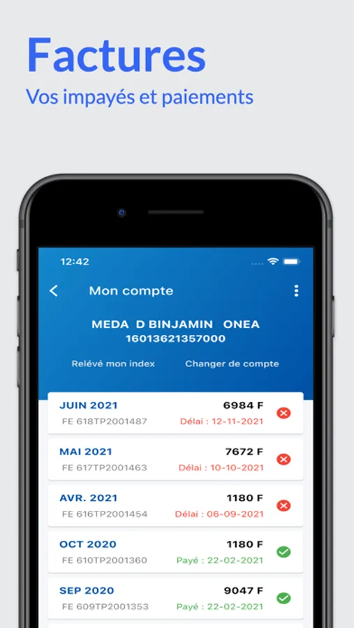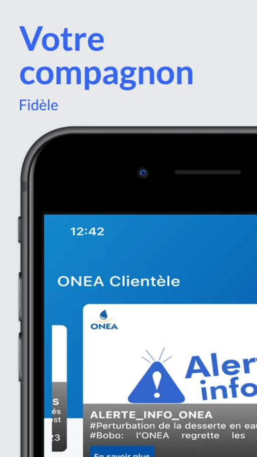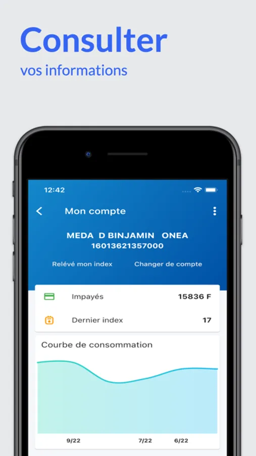 Consulter vos impayés et relever votre index en toute simplicité.Suivez votre consommation d'eau pour mieux gérer votre utilisation.Recevez des notifications importantes concernant votre compte et nos services.Obtenez des informations sur les coupures d'eau planifiées et les incidents.Restez informé des actualités et des initiatives de ONEA.Accédez facilement à notre service client pour toutes vos questions et préoccupations.