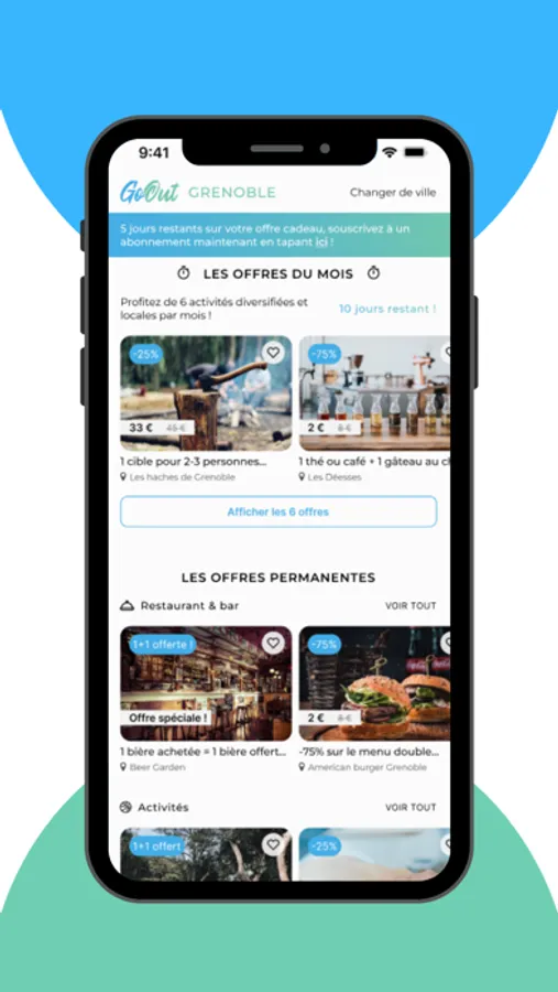 GoOut est une application qui vous propose au moins 5 activités locales et 1 événement différent par mois. Faites des économies sur vos sorties. Offres disponibles sur Grenoble et ses alentours