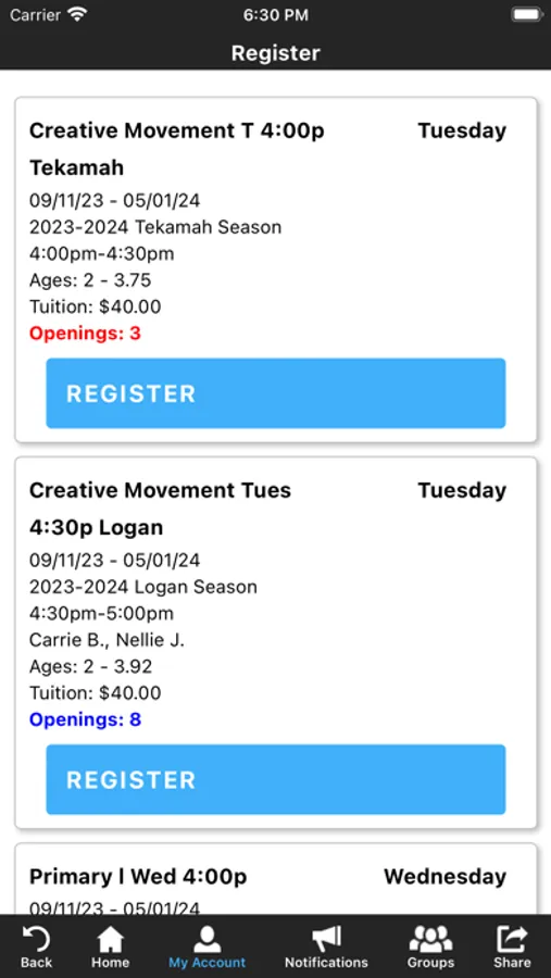 The CDA app allows you to manage your account with ease, register for classes, parties, and special events. You'll also receive important notifications about class changes, closings, registration openings, special announcements, and upcoming events.