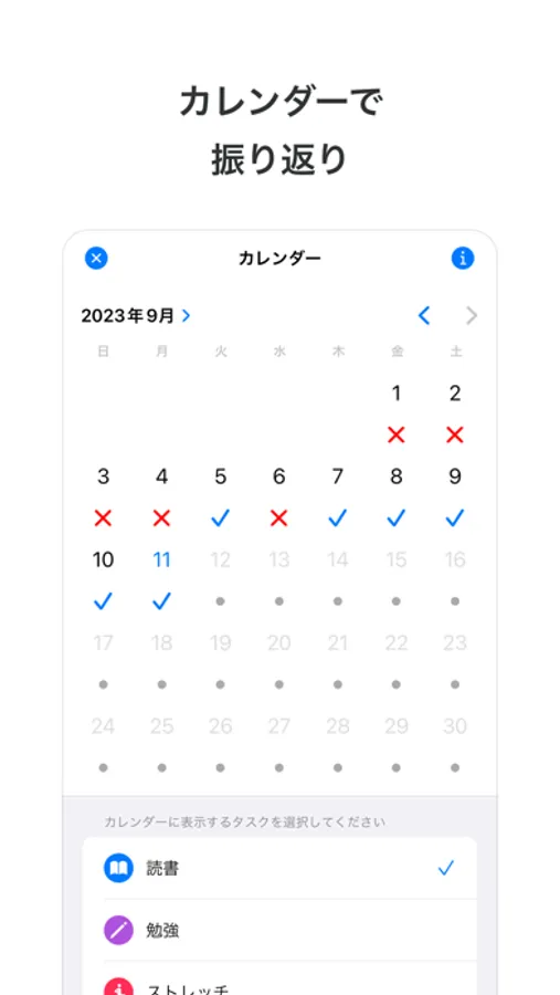 また、カレンダーでこれまでの実行状況が確認できるのでその月にどのぐらいタスクを実行できたか、一目で振り返ることができます。