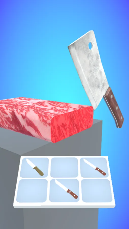 Add new knives and merge them by drag&drop. Reach new knife, axe, blades! Use them and cut foods faster!