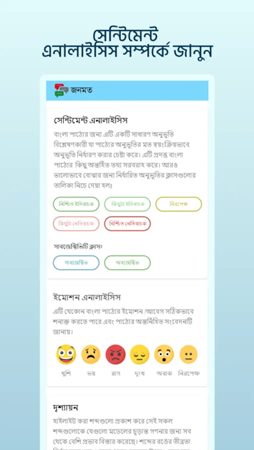After classification, a visualization box that displays sentiment and emotion will emerge at the bottom of the app, and the user will observe that some texts have been highlighted in various colors, as those texts indicates that it has a significant influence on the model's score .The color intensity depends actually on the score, the higher the score level the more intense the color will be.