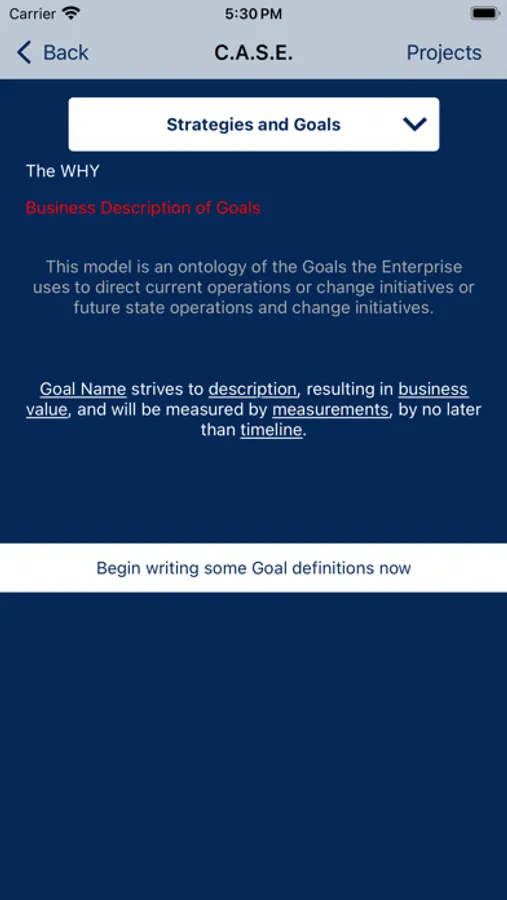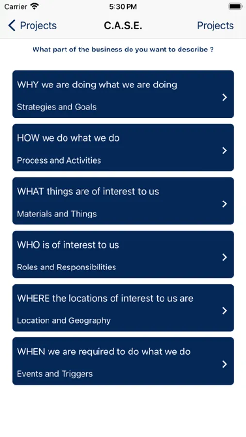 C.A.S.E. is a smartphone-based app that helps you develop and implement enterprise architecture and business architecture. It is the smartphone-based entry point to the EACOE and BACOE methodology, which is the only fully integrated environment that guides practitioners through the full development of an enterprise architecture or business architecture.