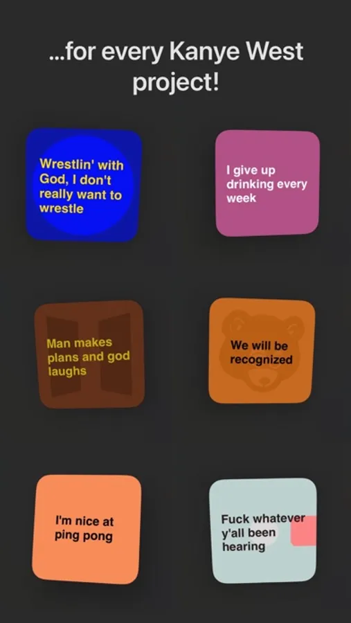 Cheer yourself up with some funny, inspirational, and genius quotes from Ye himself. Swipe down to retrieve a new one. Tap the quote to share it.