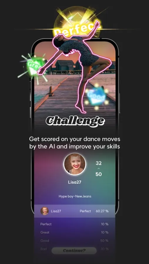 - STEPIN’s real-time motion tracking AI precisely evaluates the accuracy of your dance moves.