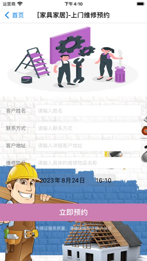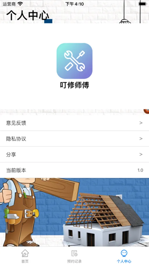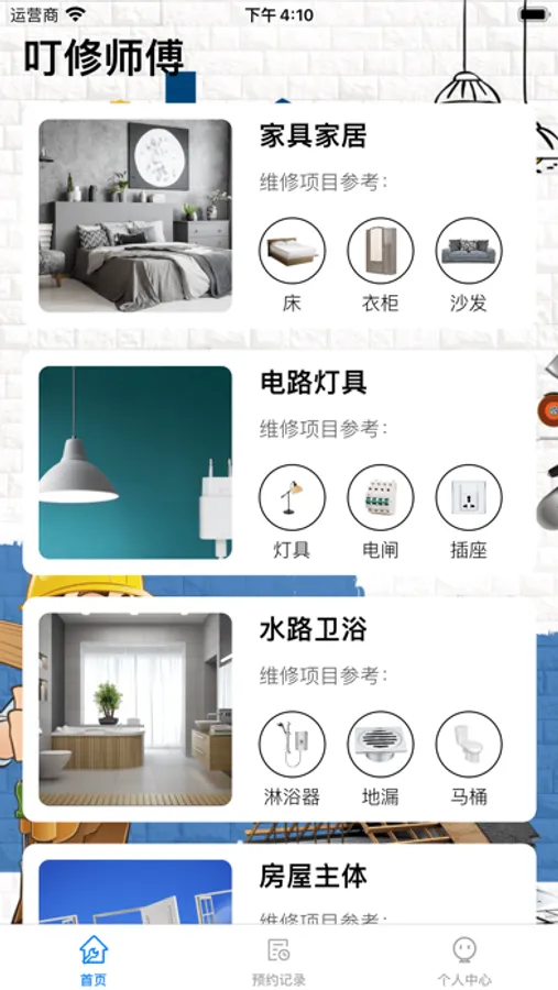 欢迎使用叮修师傅,我们为用户提供家具家居、电路灯具、水路卫浴和房屋主体的上门维修服务,在线填写信息预约即可联系师傅上门维修,让您的维修体验轻松且愉快。