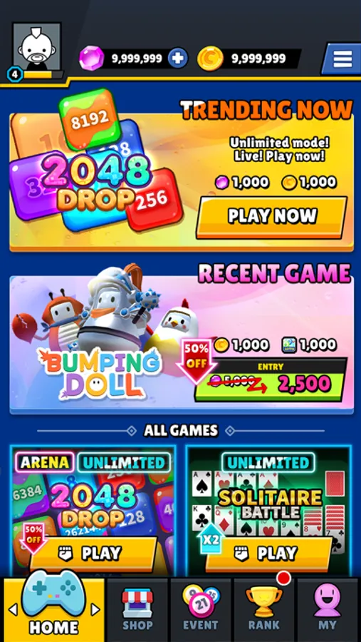 - Bumping Doll: A free-for-all survival game of 9 dolls including NPC at the special arena. Be the last man standing with a drag attack & east tap!
