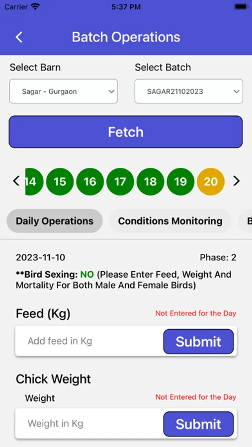 •Calculate feed conversion ratio based on input feed & last day chick weight.